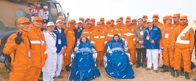 二〇一六年十一月十八日,航天員景海鵬(左)、陳冬在四子王旗著陸場(chǎng)順利返回。