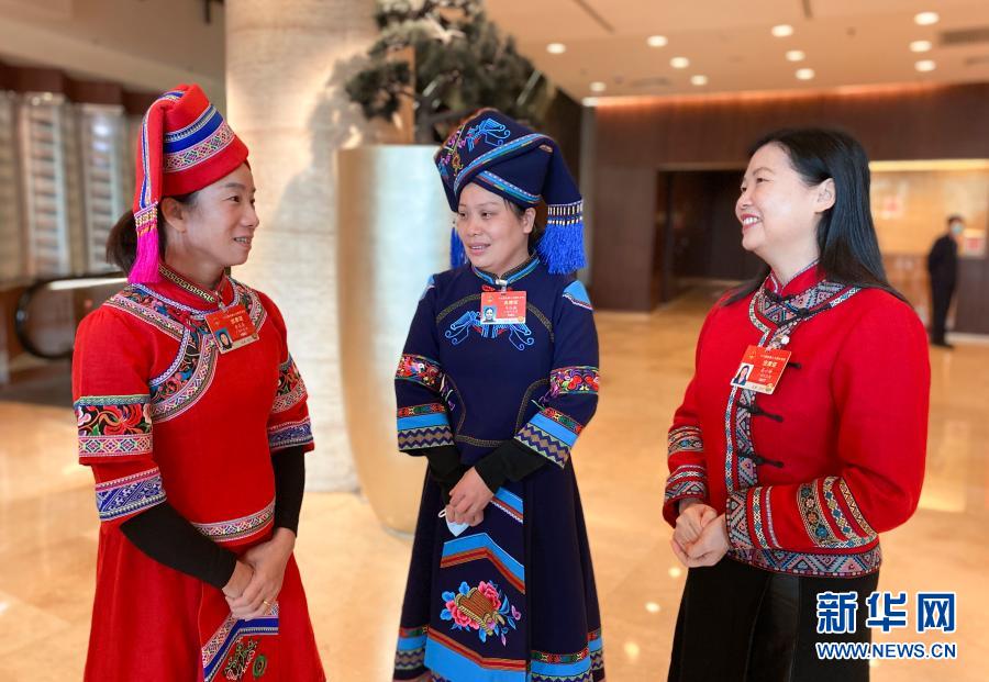 3月6日,三位女代表在駐地交流。新華社記者 溫競?cè)A 攝