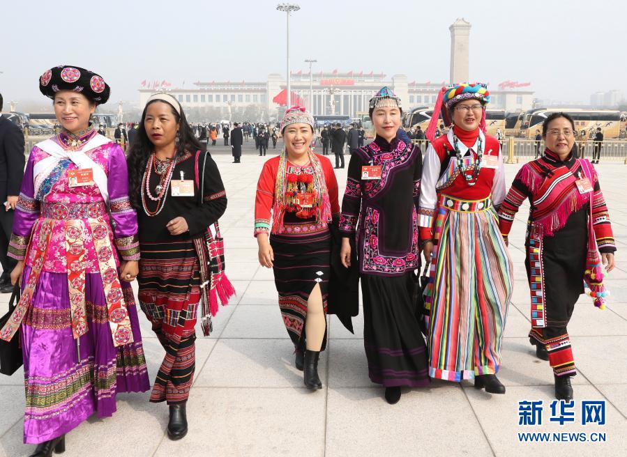 3月4日,中國人民政治協(xié)商會議第十三屆全國委員會第四次會議在北京人民大會堂開幕。這是女委員們走向會場。新華社記者 張玉薇 攝