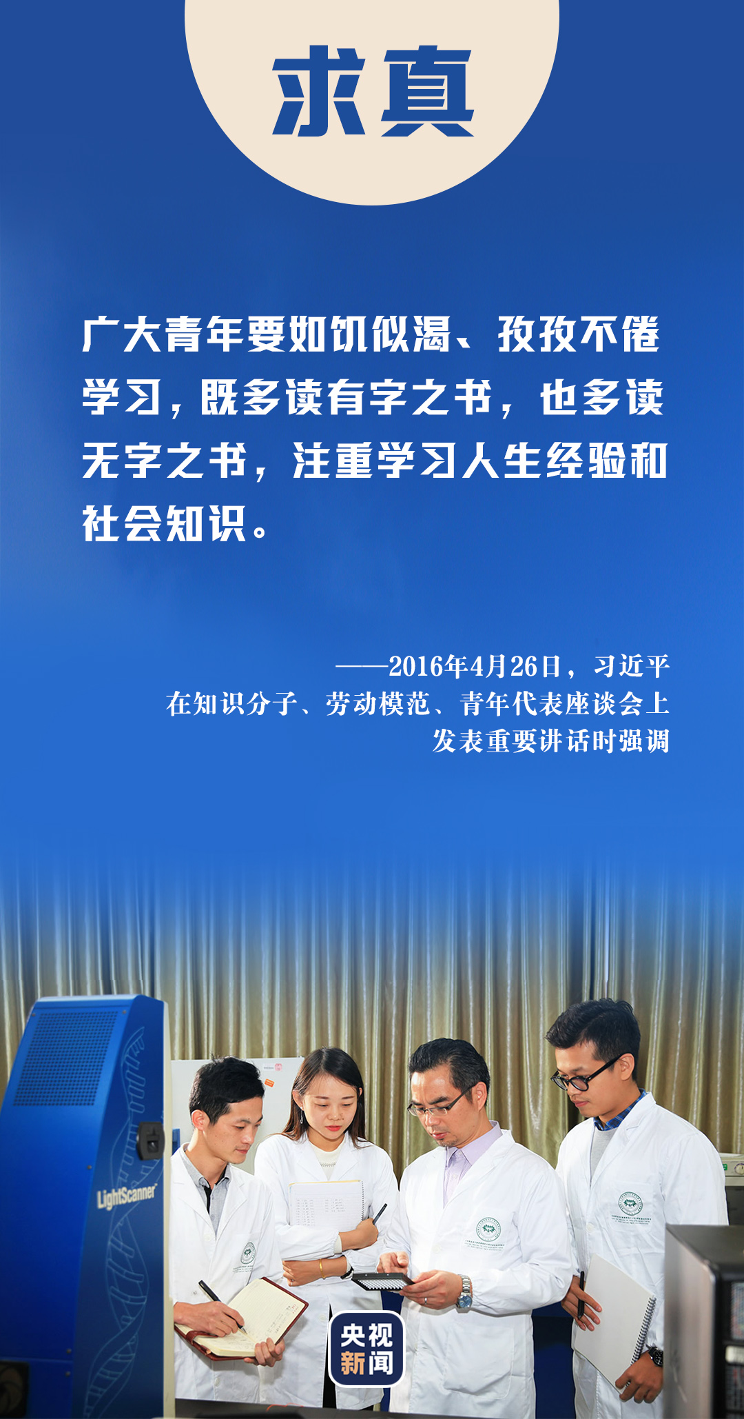 2013年五四青年節(jié),習(xí)近平總書記來到中國航天科技集團公司中國空間技術(shù)研究院,與青年代表座談??倳浿赋?,廣大青年要堅持面向現(xiàn)代化、面向世界、面向未來,增強知識更新的緊迫感,如饑似渴學(xué)習(xí),既扎實打牢基礎(chǔ)知識又及時更新知識,既刻苦鉆研理論又積極掌握技能,不斷提高與時代發(fā)展和事業(yè)要求相適應(yīng)的素質(zhì)和能力。