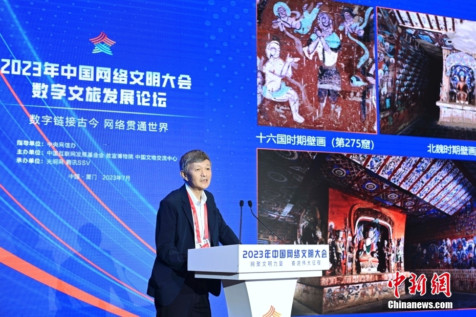 7月19日,2023年中國網(wǎng)絡(luò)文明大會數(shù)字文旅發(fā)展論壇在福建省廈門市舉辦。論壇以“數(shù)字鏈接古今 網(wǎng)絡(luò)貫通世界”為主題,邀請國內(nèi)外數(shù)字化、文博考古、旅游等領(lǐng)域?qū)<液痛砉餐剿鞴偶奈镌跀?shù)字時代的創(chuàng)造性轉(zhuǎn)化和創(chuàng)新性發(fā)展,以及在數(shù)字技術(shù)賦能下,文旅產(chǎn)業(yè)如何實現(xiàn)高質(zhì)量發(fā)展。圖為論壇現(xiàn)場。中新社記者 田雨昊 攝