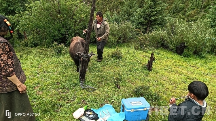 經(jīng)過一番檢查,確如電話中說的,牛傷得比較嚴(yán)重。索杰醫(yī)生馬上拿出藥箱,和牧民一起將牛的四腳綁住,打了麻藥,然后做了清創(chuàng)縫合手術(shù),再用上止血和消炎藥。手術(shù)做得很順利,索杰醫(yī)生把需要涂抹的藥拿給牧民,告訴用法用量。這時天空突然下起大雨,天色已經(jīng)很晚了,從村里到夏季牧場的路陡峭險峻,加上雨天路面濕滑,索杰醫(yī)生沒敢把藥箱帶回去,“明天我來給牛復(fù)查傷口時,再取藥箱”。