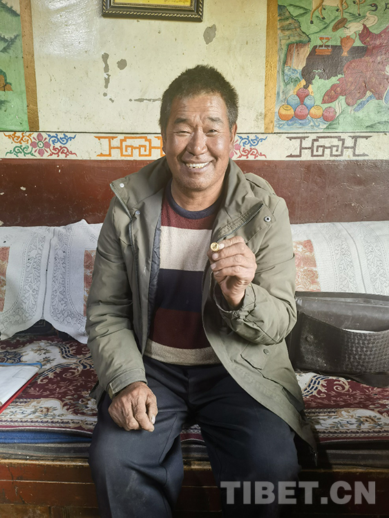 索杰醫(yī)生取出第三個包的時候,格外小心翼翼。我們因此也就更好奇,里面又是什么“寶藏”。“我1986年入黨,1997年當(dāng)村大隊的副隊長。2010年,鄉(xiāng)里在12個村的大隊長中,選兩名優(yōu)秀人員,我就是其中之一?!彼鹘茚t(yī)生邊說,邊慢慢拿出一個盒子,打開盒蓋,把手在衣服角上抹抹,然后取出一枚金黃閃亮的毛主席像章?!爱?dāng)時我們縣一共去了20人,先到那曲市委黨校學(xué)習(xí)了8天,然后到北京和大連分別參觀學(xué)習(xí)7天。在北京,我去了毛主席紀(jì)念堂、天安門、長城、鳥巢、水立方。我在天安門廣場買了鮮花,到毛主席紀(jì)念堂門口時,先是有點緊張,因為那里站崗的軍人。我把鮮花放在一個統(tǒng)一的地方,瞻仰毛主席遺容時,我緊張的心情一下子沒有了,都變成了激動?!彼鹘茚t(yī)生把手放在心臟的位置比劃著,“為了紀(jì)念毛主席,我就買了一枚毛主席像章?!?/p>