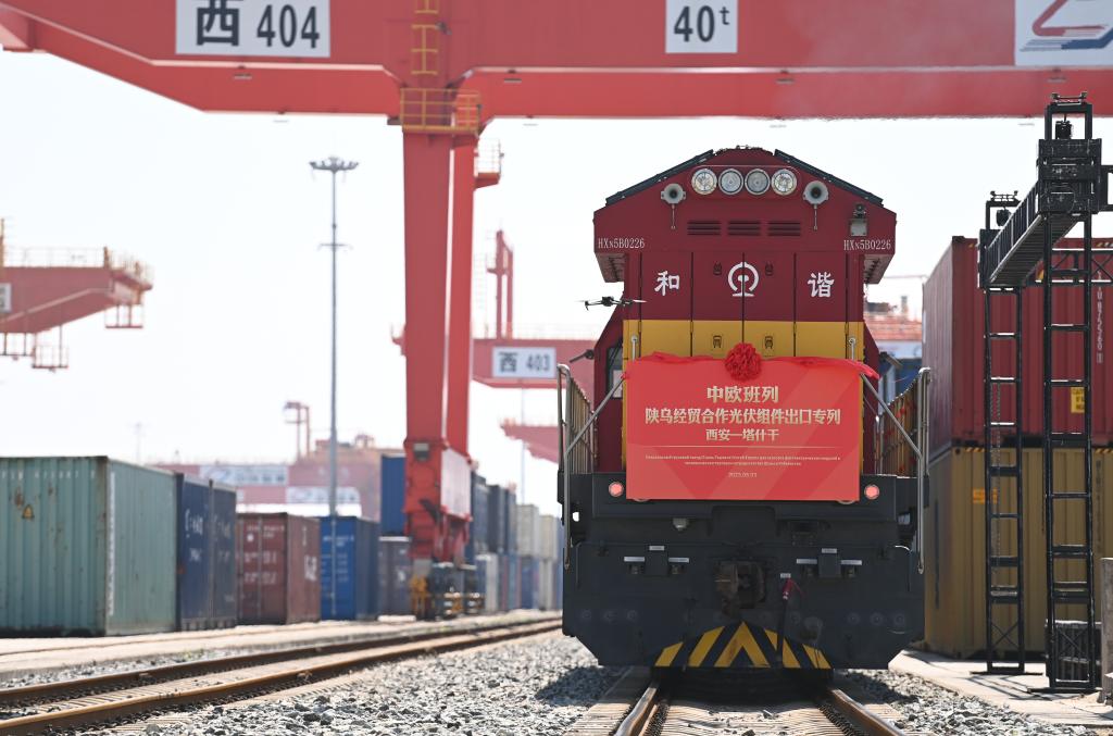 8月3日,中歐班列(西安-塔什干)陜?yōu)踅?jīng)貿(mào)合作隆基綠能光伏組件出口專列在西安國際港站準備發(fā)車。新華社記者 鄒競一 攝